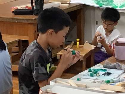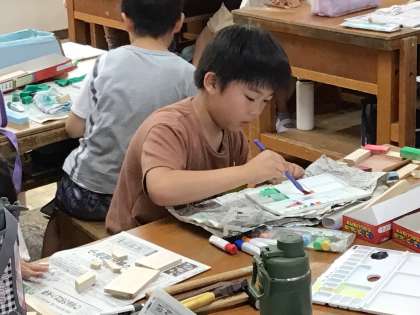 4年2組さんは、図工室で自分で切った木に色をつけていました。
