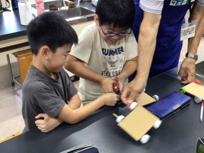 当初、体育館で作成し、クルマを走らせる予定でしたが、暑くなることも考え、1組さんは図工室、2組さんは理科室で作成し、廊下を走らせることになりました。