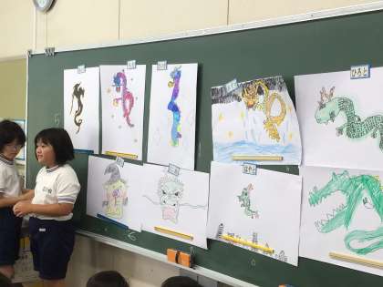 3年1組さんでは、自分たちで書いたドラゴンの絵の鑑賞会が行われていました。