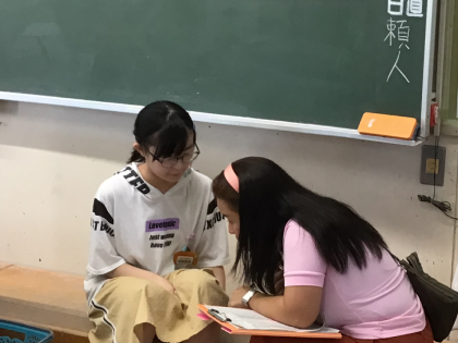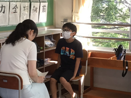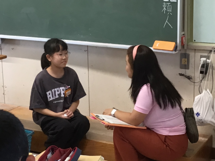 6年2組さんでは松宮先生、ジョニ先生と1対1で英会話の練習をしていました。