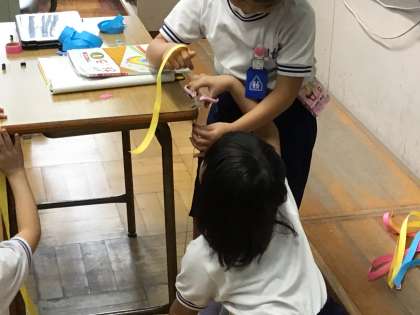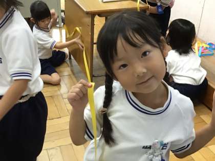 1年2組さん、算数の授業でいろいろなものをテープで測っています。