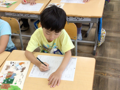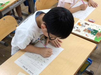 鉛筆の持ち方、書く時の姿勢などの注意を聞いてから、真剣な空気の中、字を書いていました。