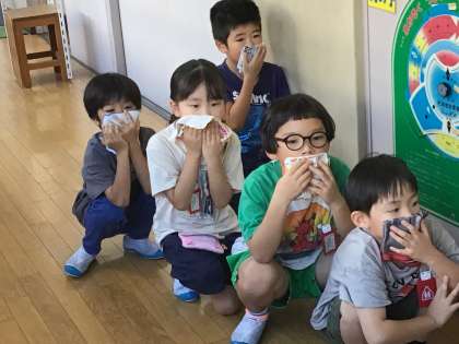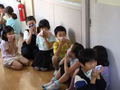 消防署の方からは「本物の煙は黒くて、吸い込まないようにしないといけないので、ハンカチなどで口を押えるとよい」ことを教えてもらいました。