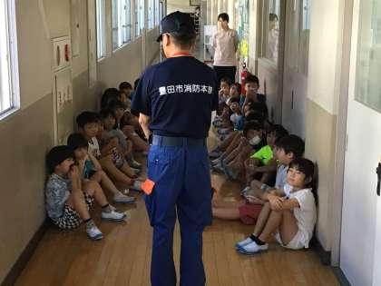 消防署の方が来てくださって、子どもたちに説明をしてくださっています。