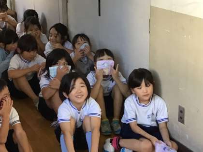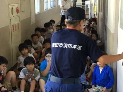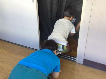 「煙が充満している部屋を通る際は、身体をかがめて、床や壁を手で触りながら進みましょう」消防署の方の説明を受けて、図工室に入っていく特別支援学級、2年2組のみんなです。