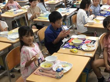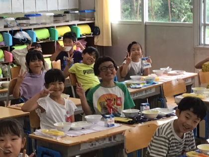 1年生の給食の様子です。 美味しくいただいています。 ほぼみんな完食ですね。