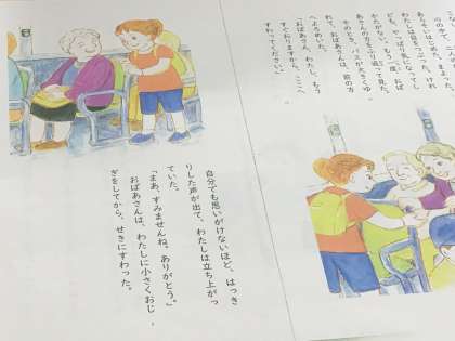 土曜日の午後、満員のバスにおばあさんが乗り込んできました。私は座っています。おばあさんは座れず、立っています。目の前に座っている高校生は外を眺めて素知らぬ顔をしています。一人どうしようかとモゾモゾシテいる女の人はいます。私は気になって、後ろを振り返りますが、2人の自分が心の中で戦っています…というような内容の教材です。