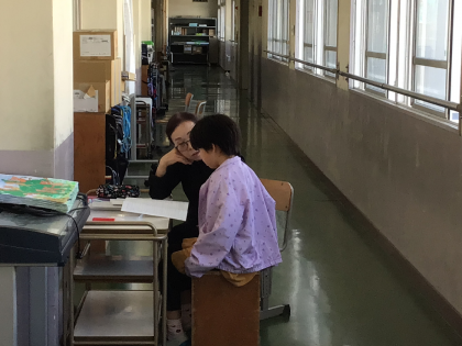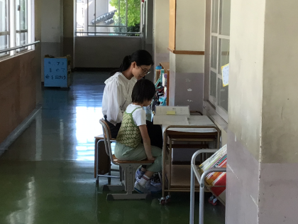 2年生の子たちが、4時間目、廊下で先生とお話をしながら、通知表をもらっていました。