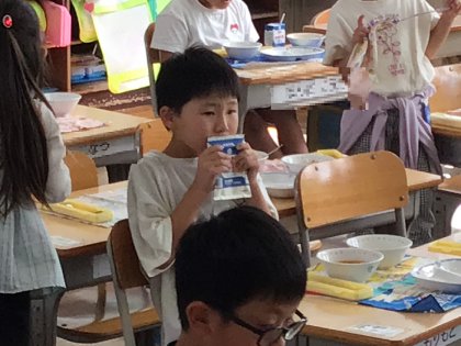 1年生の給食の様子をしばらくしてから見に行くと、ずいぶん食べ終わりそうな子が多くいました。