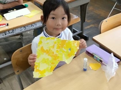 1年2組さんでは図工の授業で黄色の紙を細かくちぎって「月」を作っていました。