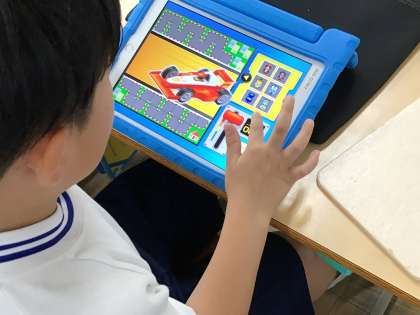 早くに終わった子はタブレットを使って、プログラミング学習の勉強をしていました。