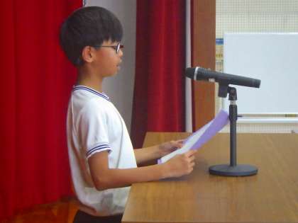 充稀くんは、2年生になり6か月、自分の成長したところ、後期の目標を話していました。友真くんは、人間関係づくりの苦労と今、頑張ろうと思っていることを話していました。2人とも全校のみんなの前で、堂々と話しており、とても立派でしたね。