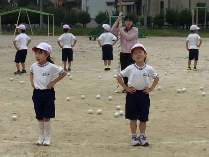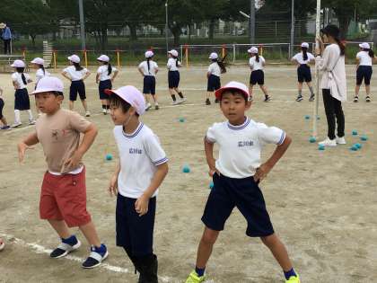 1・2年生が運動場で「玉入れ」の練習をしていました。
