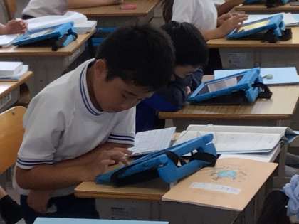 4年1組さんでは、総合的な学習の時間にタブレットを使って、自分が調べたことをまとめる勉強をしていました。