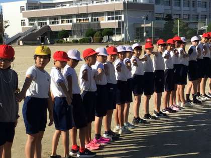 教室や体育館で練習していたものを、5年1組、2組、6年1組、2組の4クラスで合わせます。練習してきたとはいえ、微妙に動きが異なる部分もあるので、微調整をしていきます。