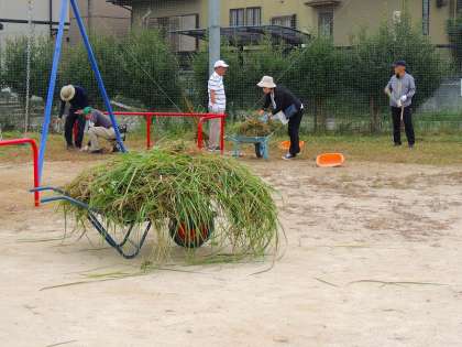 運動会を来週に控え、今日は草刈り機も使って草を刈りました。刈ったり抜いたり草を一輪車に入れ、何往復もして運びました。おかげで運動場はすっかりきれいになりました。