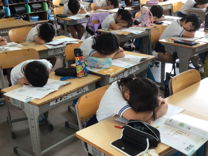 黒板を見ないようにして、九九の4の段を言えるか、確認している様子です。