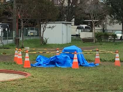 市役所にすぐ連絡し、「公園つかう課」の方がその日のうちに警察の方と一緒に現地に来てくださったそうです。特に人に害を及ぼす危険性はないことが確認できましたが、念のため、カラーコーンで囲いをし、入れないようになっています。