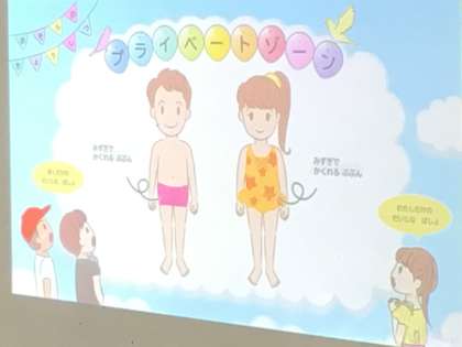 『プライベートゾーンとは、水着を着るときに隠れる部分』のことを言うこと、大事なところなので、触ったりしないこと、などのお話を聴いていました。