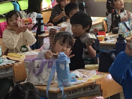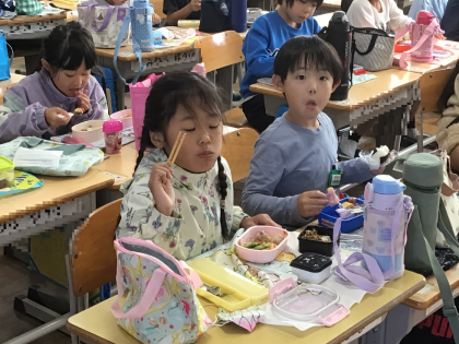 弁当箱を持って、お行儀よく食べる1年生のみんなでした。