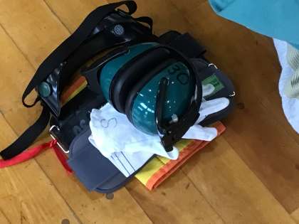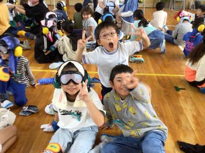 ひざ、足首、手袋、手首、ゴーグル、イヤーマフの順番で、全部で6個の装具をつけてもらいます。