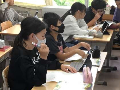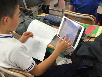 テストを返してもらい、タブレットに写った模範解答を見ながら、見直しをしていました。点数はいいに越したことはないけれど、同じ正解でも自信満々の〇と、少し不安だったけれど〇になったでは意味が違うので、点数がよかった子も見直しはしっかりするといいですよ。