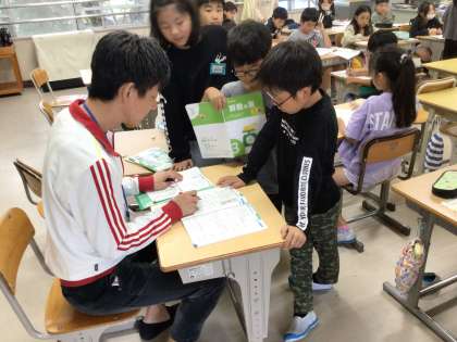 3年2組さんでは算数の授業で、修万先生と中川先生、2人に丸付けをしてもらいながら、問題にチャレンジしていました。