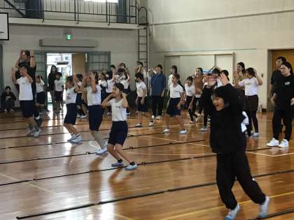 ジャンプをしながら上半身でいろいろな動きをしていくのは、思いのほか、難しそうですが、お父さん、お母さん方はさすがです。とてもスムーズに身体が動きます。