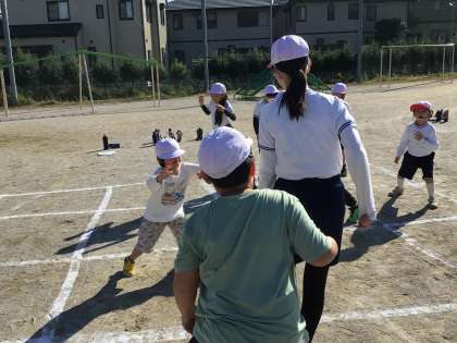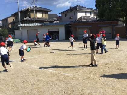 他にも碁盤のマス目を1つずつリズムに合わせて鬼に捕まらないように逃げるゲームやフリスビードッジをしているグループもありました。