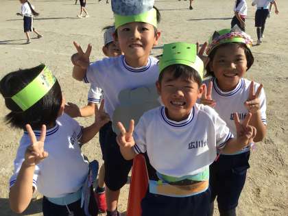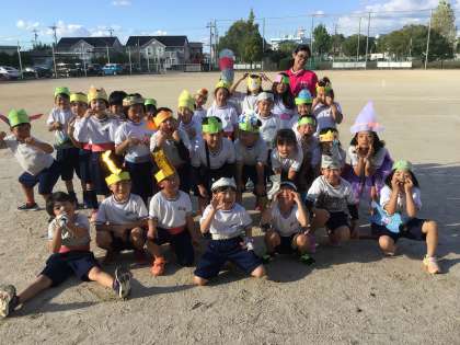 ハロウィンパーティのためにつくった衣装を着て、楽しいことをしようということだそうです。下の写真は、こおり鬼をやっている最中に撮った写真なので、周囲を気にしている子もいます。上の写真は終わった後に、クラスみんなで撮った変顔の集合写真です。