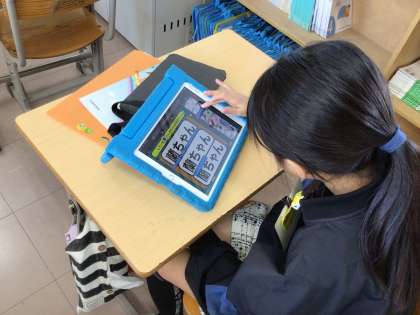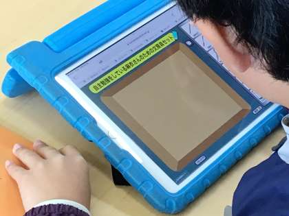 学習用タブレットの中で「〇〇している〇〇さん(自分以外)のための文房具セット」を考えて、いれていきます。タブレットの操作でわからない所があったら、先生や友達に聞いて取り組んでいました。