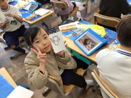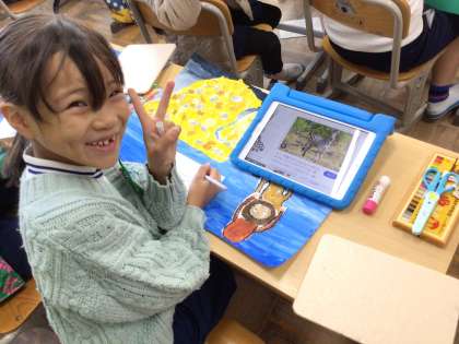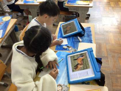 動物は、ねずみ、さる、きつね、らいおん、しまうま、きりん、ぞう、かめの順番で描くそうです。学習用タブレットで、動物の画像を調べてから画用紙に書き写していました。