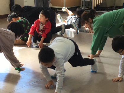 一番上の写真は、みんなで「ドラゴン」になってみようとしている所です。先頭の子が決まると、創作で頭役の子、角役の人、尾っぽと考えて、つながっていきました。一番下の写真は、友達がやる動きを真似してみようということで、床をスーッと走ったり、滑ったりしていました。