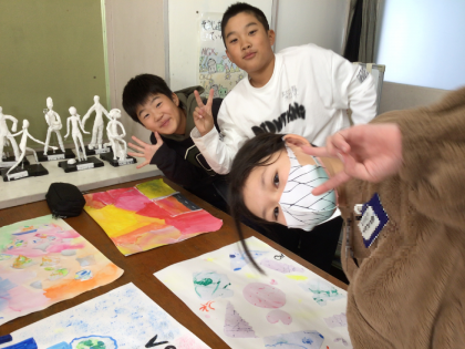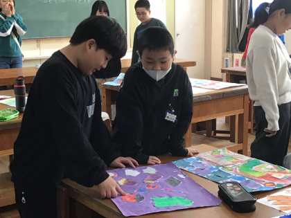 5年1組さんが図工室で、友達の作品を見合い、感想を言い合う取組をしていました。