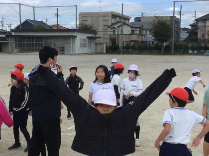 3年2組さん、体育の授業です。縄跳びの練習をする前にウォーミングアップをみんなでしていました。