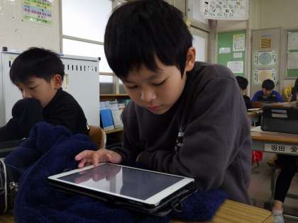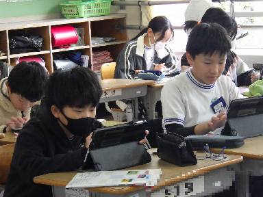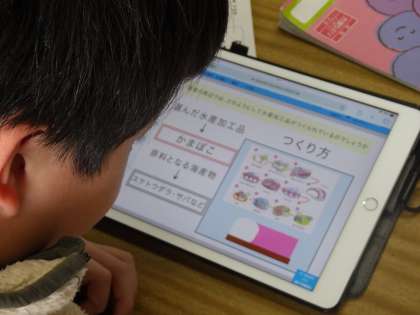 社会科としての知識を得ることはもちろん、学習用タブレットを使って、わかりやすくまとめる力や相手に伝える力も養おうとしています。