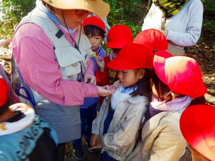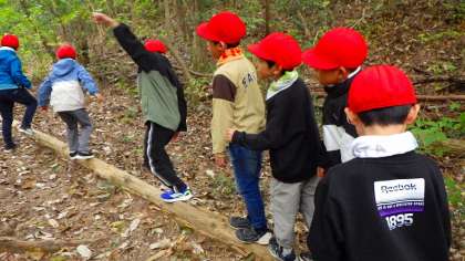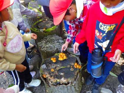 丸太の上を歩いてみたり、きのこでしょうか、木から生えているものを観察しています。