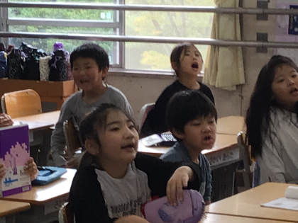 数分間、取り組んだ後は、ホワイトボードに松村先生が映し出してくれたものを全員で言う勉強をしていました。リズミカルに音をつけて、答えを言っていて面白そうでした。