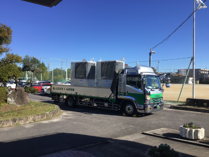 今日は大きなクレーン車が駐車場に入り、体育館のエアコンの室外機を設置してくれています。