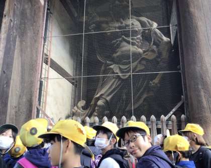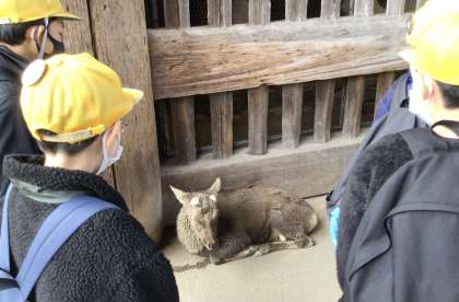 金剛力士像のすぐ下に鹿がいて、みんなビックリでした。
