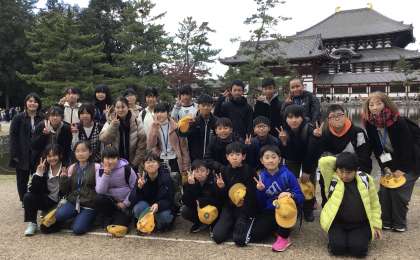 6年2組の子たち、東大寺をバックに記念写真を撮りました。