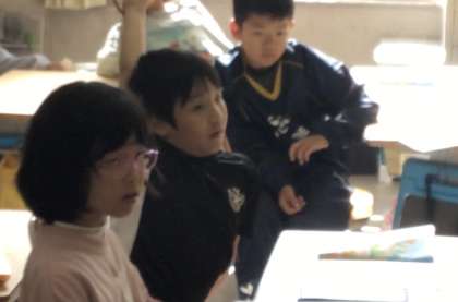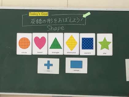 スクリーンに映し出された形から、動物の種類を考えて、英語で答えていました。