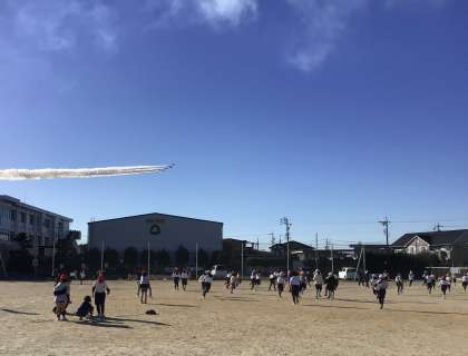 ブルーインパルス みんなで見ました 公開日 2024/11/21 更新日 2024/11/21 校長室から ブルーインパルスが飛ぶ方向に向かって、一人の子が運動場を追いかけ始めました。 すると次々と追いかけていく子が…。