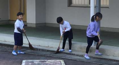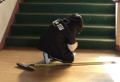 教室や廊下、階段、体育館前など、いつも通りに手分けをして、掃除してくれています。