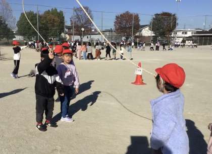 高学年、中学年のお兄さん、お姉さんのように連続ジャンプは難しそうです。一人ずつ順番に入っていきます。入るタイミングが難しいので、待っている子たちが合図をしてあげていました。