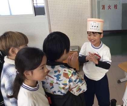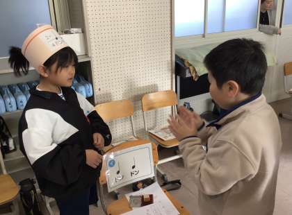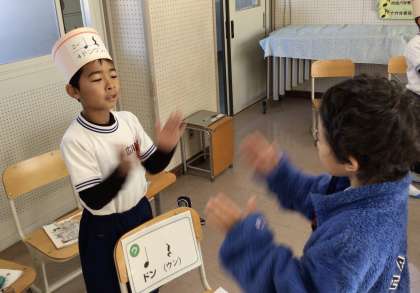 6人の店長さんの所に訪れて、「ドンドコ」「ドコドコ」などのリズムを教えてもらっています。
