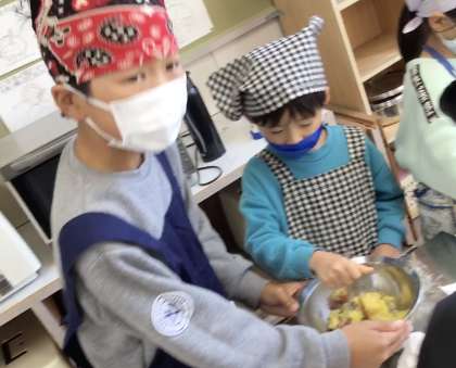 1・6年生 ちゃきんしぼり作りの様子です 公開日 2024/12/03 更新日 2024/12/03 校長室から サツマイモに砂糖を入れて、潰していきます。 だんだんトロトロになってきた子も出てきました。
