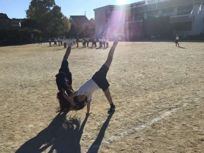 *写真は長縄の練習の時に、4年生の女の子が「側転をするから見てください」と言って見せてくれた様子です。写真だと分かりづらいかもしれませんが、綺麗に足も伸びて、2人がシンクロしていて上手でした。
