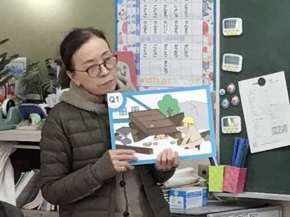 2年生では先生が問題を読みます。状況が想定しやすい絵を見せながら話します。