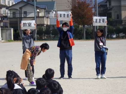 その後、校長の話で「地震が起こった時に安全な場所は?」というテーマで話をしました。「体育館」「教室」「運動場」安全な順番に並び替えてもらいます。(左から順に安全だと思う場所に先生たちを動かして並べ替えています。写真は4年生のこうのすけくんが先生たちに動いてもらっている様子です)なかなか正解がでませんでしたが、最後は6年生の子が、見事、正解しました。(さすが、6年生です)